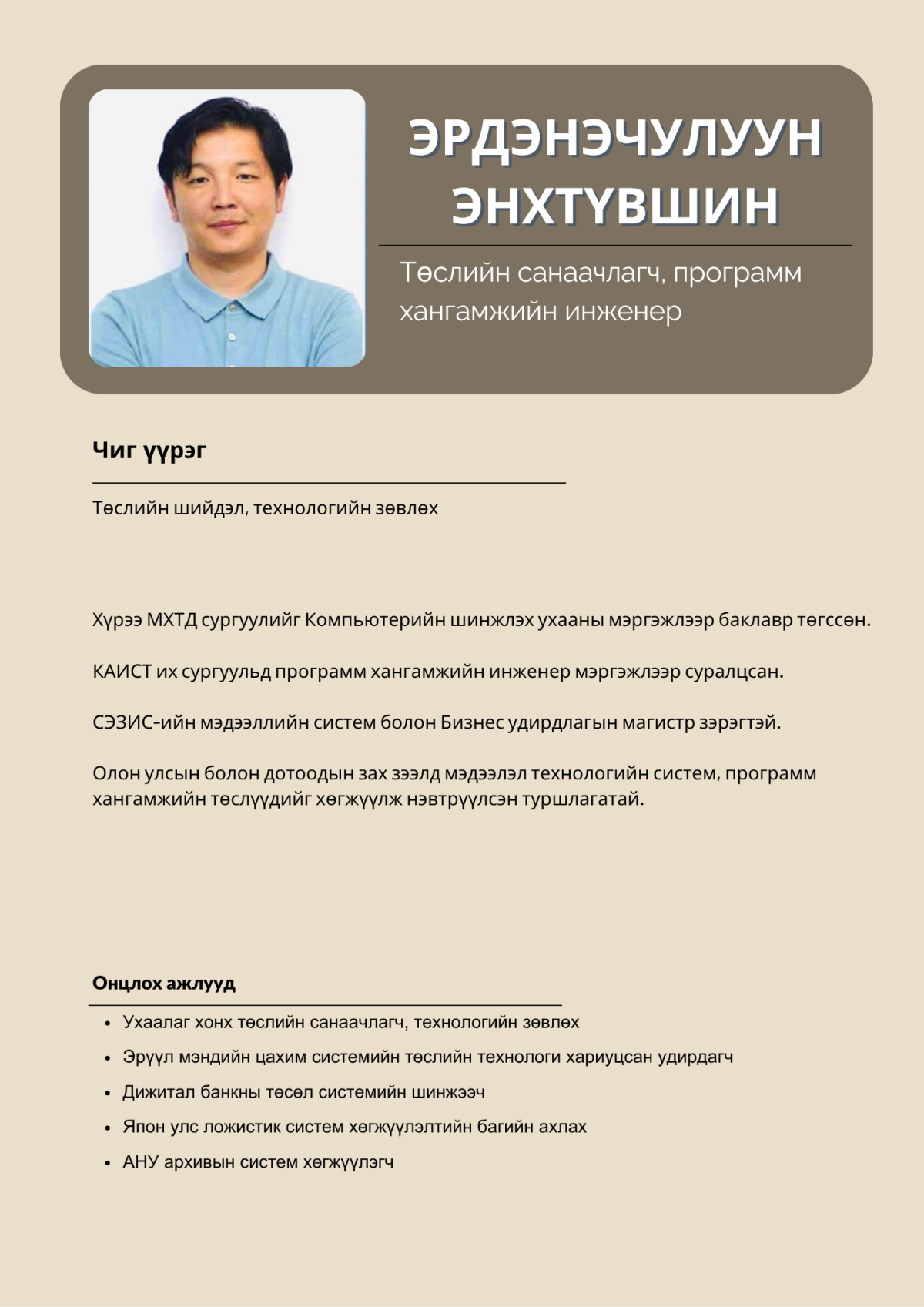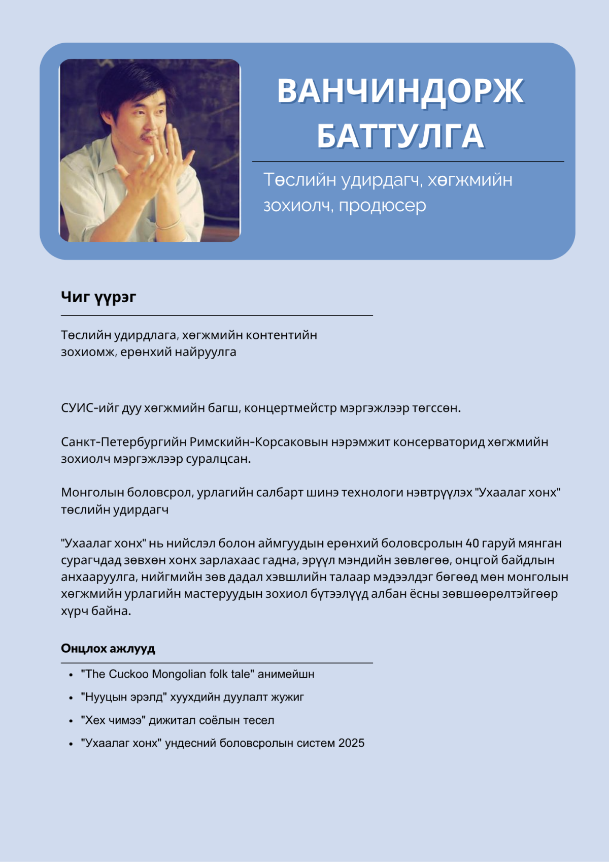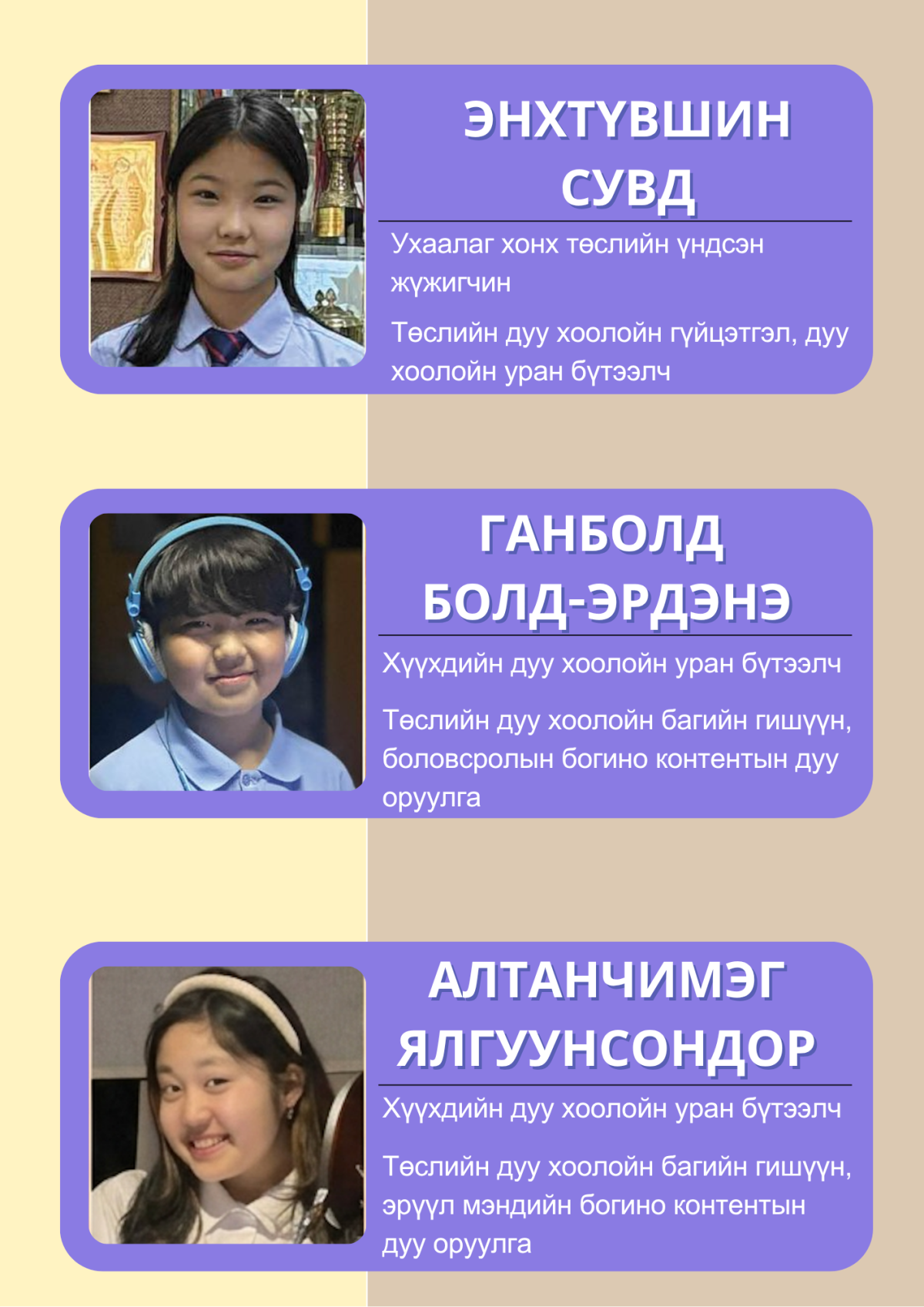 “Монгол хүүхдийн сэтгэлд өв уламжлал, урам, соёл, ухаарал түгээх дуу авиа ” Энэхүү төсөл нь боловсролын орчныг дуу, дүр, технологийн нэгдлээр баяжуулж, хүүхдэд соёл, хүмүүжил, эерэг хандлага төлөвшүүлэх зорилготой.