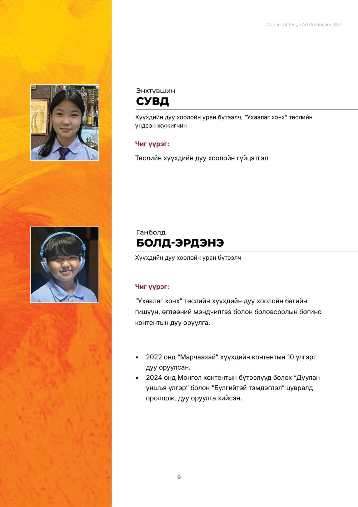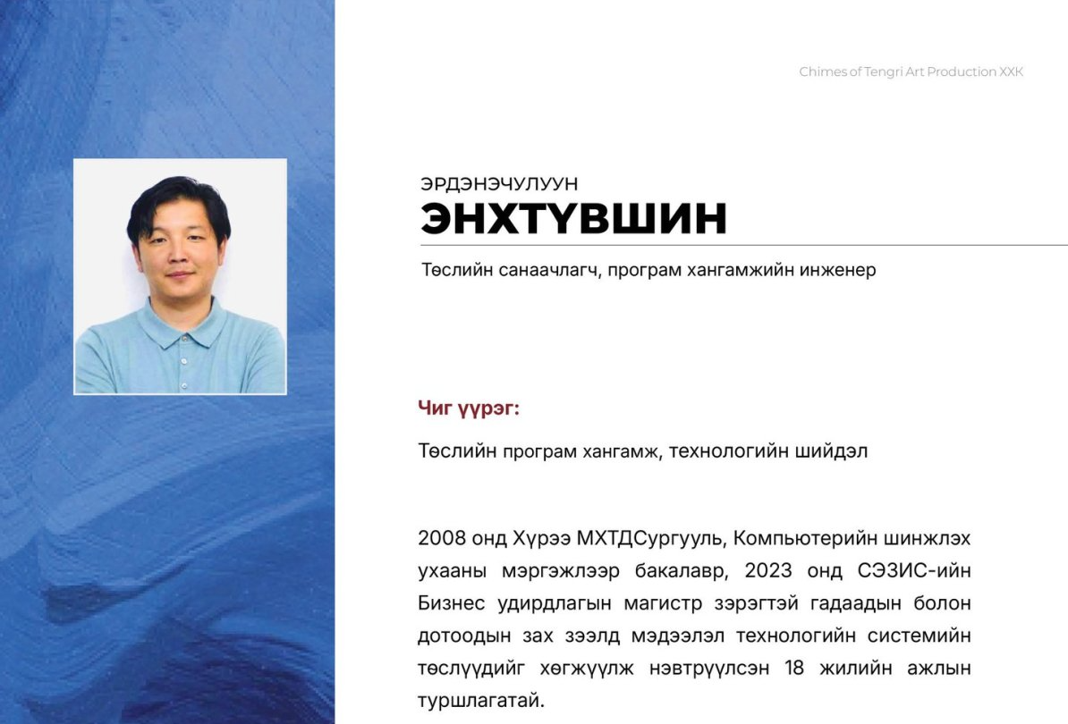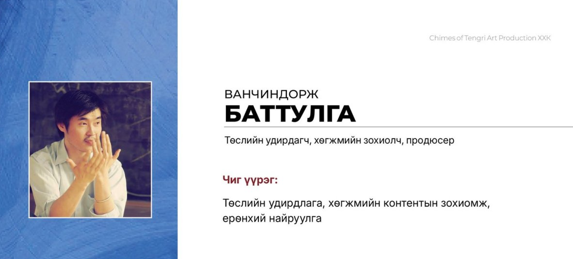 “Монгол хүүхдийн сэтгэлд өв уламжлал, урам, соёл, ухаарал түгээх дуу авиа ” Энэхүү төсөл нь боловсролын орчныг дуу, дүр, технологийн нэгдлээр баяжуулж, хүүхдэд соёл, хүмүүжил, эерэг хандлага төлөвшүүлэх зорилготой.